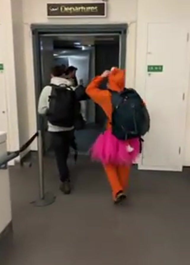 A group of people walk through a "Departures" doorway in a building, likely an airport. The person in the foreground is wearing an orange fox costume with a pink tutu and a white tail attached. They are carrying a dark backpack. Other people are ahead of them, also with backpacks. The walls are white, and the floor is gray. A sign labeled "LB 19 3" is visible on a doorframe to the right. The doorway has a metal frame and a black barrier post is visible in the left foreground.