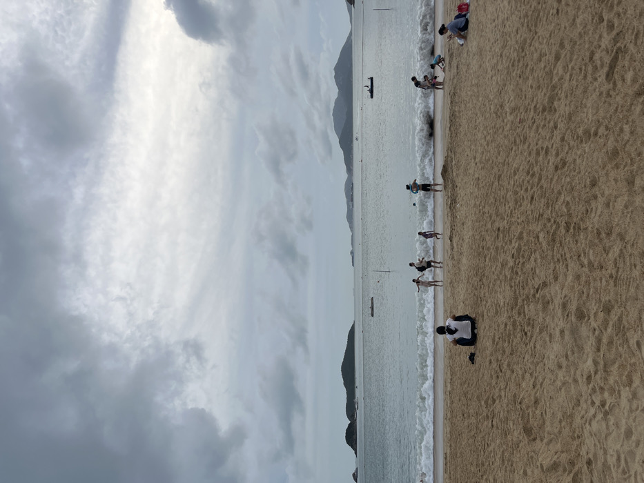 A beach scene under a cloudy sky. Calm water meets the sandy shore. People are sparsely scattered along the beach, some near the water's edge. A person is sitting on the sand in the foreground. Distant mountains are visible across the water.