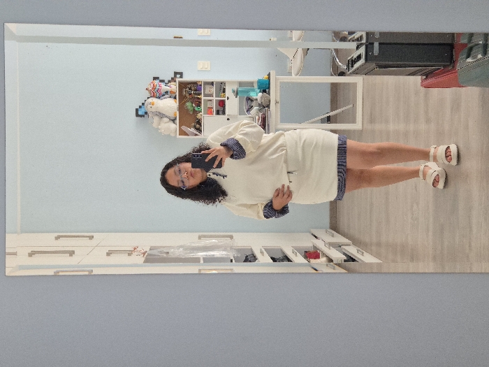 A woman with glasses and curly hair stands in front of a large mirror taking a photo with her smartphone. She wears a white dress with blue stripes and white sandals. The mirror reflects a room with white cabinets, a shelf with toys and trinkets, and a light blue wall. The floor appears to be light-colored wood or laminate.