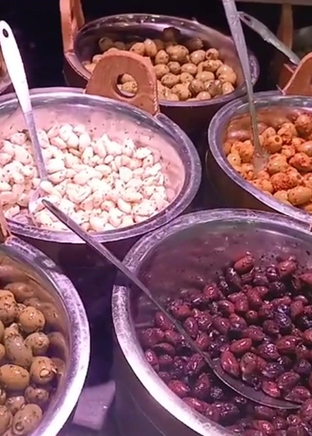 - "A display of assorted olives in stainless steel bowls with wooden handles and spoons" by FM-GqrYX2, licensed under CC BY 4.0