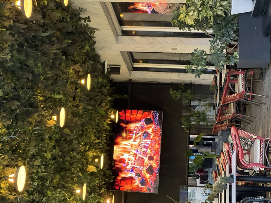 The image displays an unoccupied outdoor or semi-outdoor dining area of a cafe or restaurant in an urban setting within Tangier, Morocco. The overhead canopy is densely covered with artificial green foliage, from which numerous inverted, dark-colored industrial pendant lights with light interior surfaces are suspended and illuminated. On the left side, a large rectangular LED screen is mounted against a dark wall, prominently displaying a high-resolution, simulated image of a burning fireplace with logs and active flames. To the right, a building facade features vertical white marble panels interrupted by dark vertical elements, with glass windows or doors reflecting portions of the interior or opposing street elements, including a distorted reflection of the fireplace screen. The dining area is furnished with multiple dark-topped tables on dark bases, surrounded by numerous chairs characterized by red frames and woven patterns in red, black, and white, each equipped with a light-colored cushion. Small potted plants are present on some tables, and larger green plants are arranged in dark planters on the ground, which appears to be a paved or tiled surface. No individuals are visible in the immediate seating area.