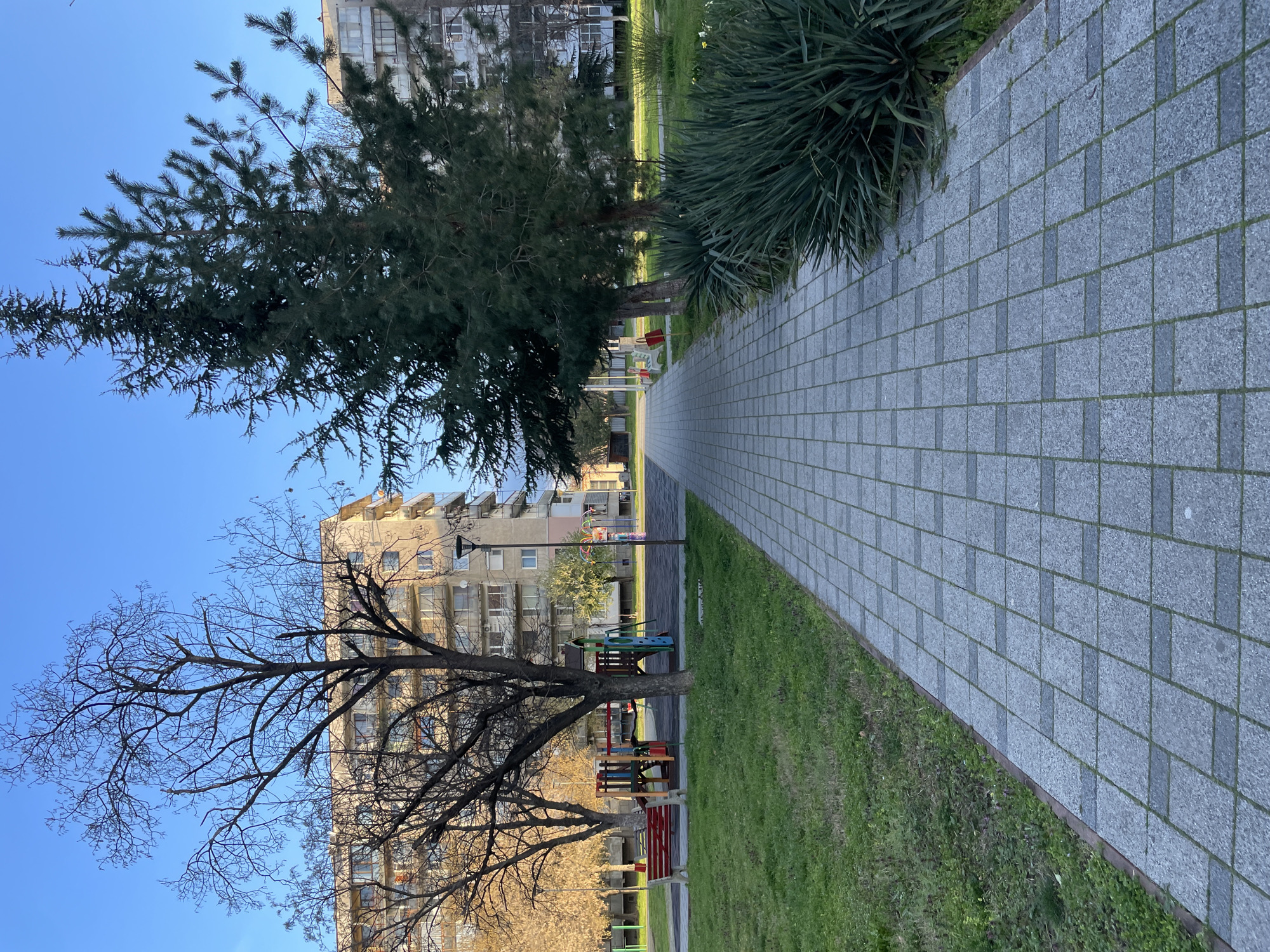 The image depicts a paved walkway in Pazardzhik, Bulgaria. The path is constructed of rectangular gray paving stones. Green grass borders the walkway on both sides. A tall evergreen tree stands to the left of the path, partially obscuring a residential building in the background. A leafless tree is visible in the foreground, also to the left of the walkway, with a playground beneath. To the right of the walkway are some green bushes and the building is further in the distance. The sky is blue. There are no visible people in the image.