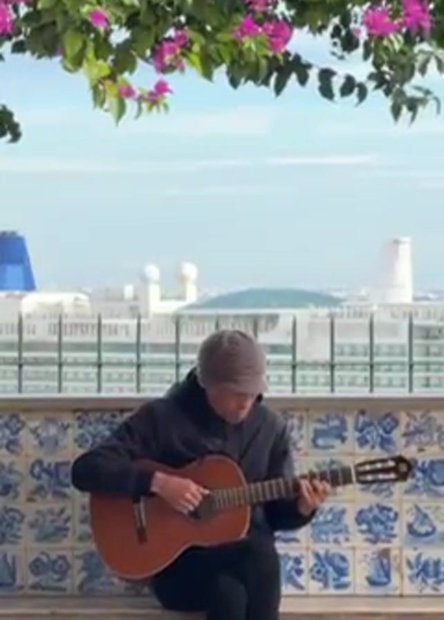 A man sits on a bench and plays a classical guitar. He wears a gray knit hat and dark clothes. The bench is adorned with blue and white tiles. Behind him, a cityscape can be seen on a bright, sunny day. Above, a vibrant bougainvillea vine with pink flowers frames the scene.