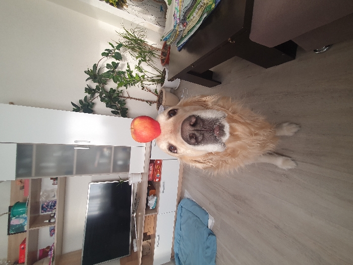 - "A golden retriever balances a red apple on its nose" by FM-HsUWg2, licensed under CC BY 4.0