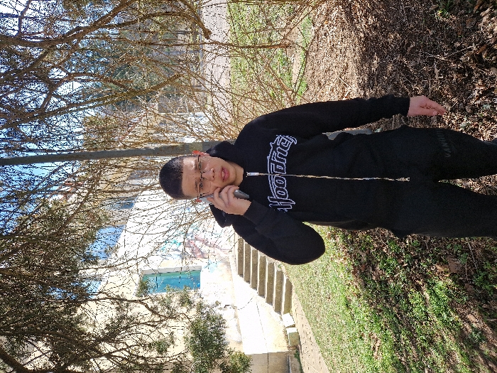 A young male, approximately 18-25 years old, is depicted standing outdoors in the city of Troyan, Bulgaria, engaged in a phone call. He has short, dark hair, wears clear-framed eyeglasses, and holds a grey smartphone to his right ear. He is dressed in a black hooded sweatshirt with "Hoodrich" printed in white on the chest, featuring a prominent silver zipper, and black athletic pants with "VANQUISH" printed on the left thigh. The background reveals a light-colored building on the left with a visible blue door or window frame and stone steps leading upwards. Faint graffiti is present on the lower section of the building wall. The environment includes numerous bare tree branches suggesting a late winter or early spring season, a dark vertical pole to the right of the subject, and ground covered with patchy green grass and dry leaves. The scene is illuminated by natural daylight.