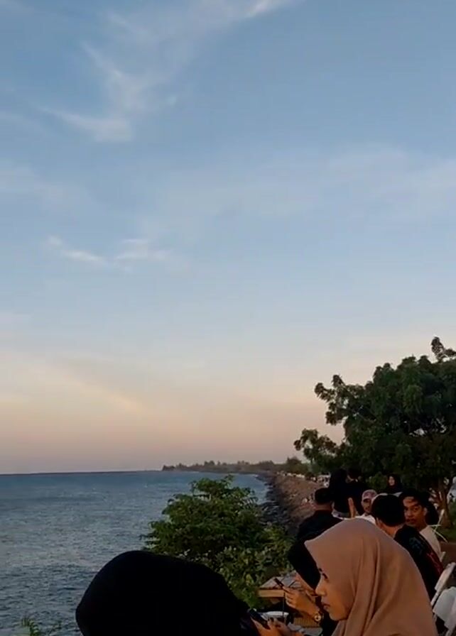 seaside scene with a view of the ocean and sky. People are sitting and standing by the water, some eating at tables. The sky is a gradient of blue and light orange with wispy clouds. Trees and greenery are present along the edge. In the distance, there is land visible across the water. A small boat is seen moving on the water surface. The camera pans up from the group of people to focus on the ocean view.