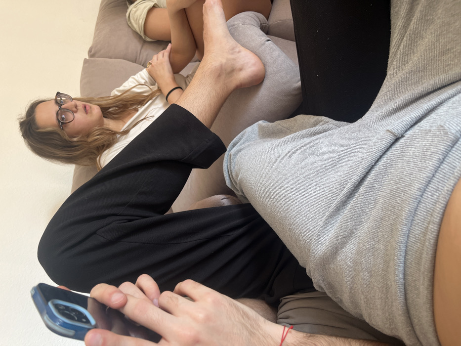 woman with glasses lying on a couch with a child, likely asleep with feet visible. A person is holding a phone, suggesting they are taking a picture. Someone is wearing black pants, and another individual is wearing light grey sweatpants. The scene is intimate and relaxed, likely captured in a home environment.