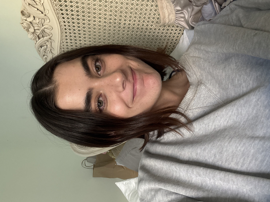 This image depicts a female subject in a mid-shot view, smiling directly at the camera from an indoor setting in Madrid, Spain. She has dark brown, shoulder-length hair with a middle part, hazel eyes, and a fair complexion with visible freckles. She is wearing a light grey, ribbed crew-neck sweatshirt. The background features a light green wall on the left, a partially visible white pillow, and a brown paper bag with handles. To the right, an ornate, cream-colored headboard with carved details and a cane webbing panel is visible, alongside rumpled light-colored fabric, likely bedding.