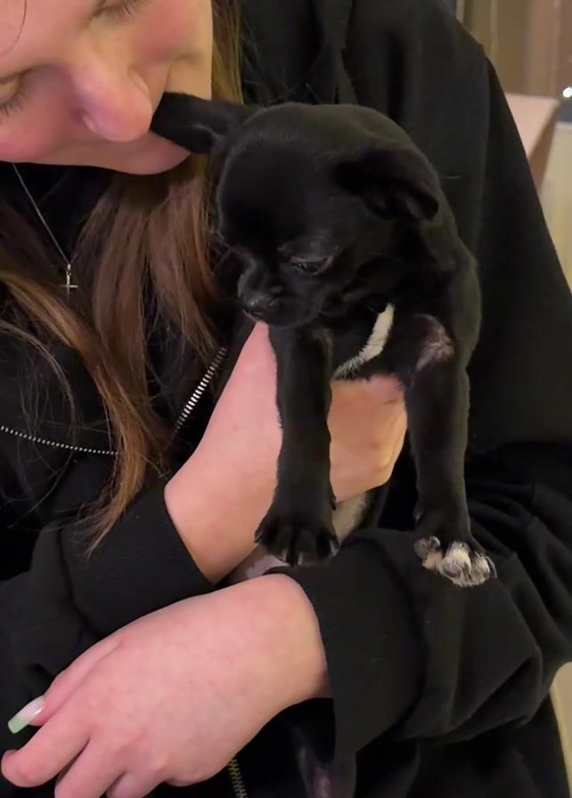 A young woman in a black hoodie is holding a small, black and white puppy