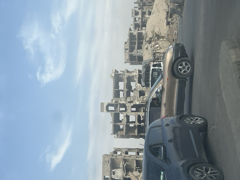 The image depicts a street scene in Joubar Municipality, Syria, under a light blue sky with sparse, wispy white clouds. In the background, multiple multi-story concrete buildings are visible, extensively damaged with large sections of their walls and interiors exposed, consistent with heavy destruction. Piles of rubble and dirt mounds are present around the bases of these structures, indicating a demolished or war-affected urban landscape. In the midground, a paved road shows vehicular traffic. A dark blue SUV (Kia Sportage type) is partially visible on the left, facing right. To its right and slightly behind, a gold/tan Hyundai Santa Fe SUV is positioned, also facing right. A male with a dark beard is visible in the driver's seat of the Santa Fe, looking forward. Behind the Santa Fe, a white pickup truck with a black roof rack and covered bed is partially visible. Concrete barriers or bollards are present on the right side of the road, further into the midground. The foreground consists of a grey curb and the edge of the paved road. The overall environment appears dusty or hazy.