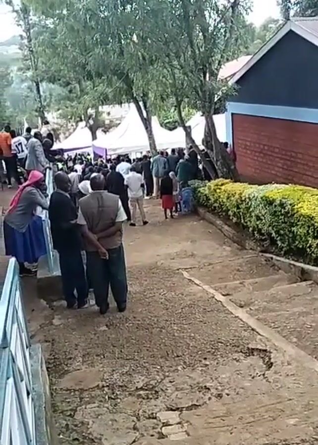 A group of people are gathered outside on a pathway with stairs. Many are dressed in formal attire, some are in casual clothes. Several white tents are set up further down the path, where most of the crowd is congregated. There are trees providing shade over the area. A building with a red brick wall and dark blue trim is to the right of the pathway, bordered by a low, green hedge. The footage seems to be captured from a slightly elevated perspective, looking down the path towards the crowd.