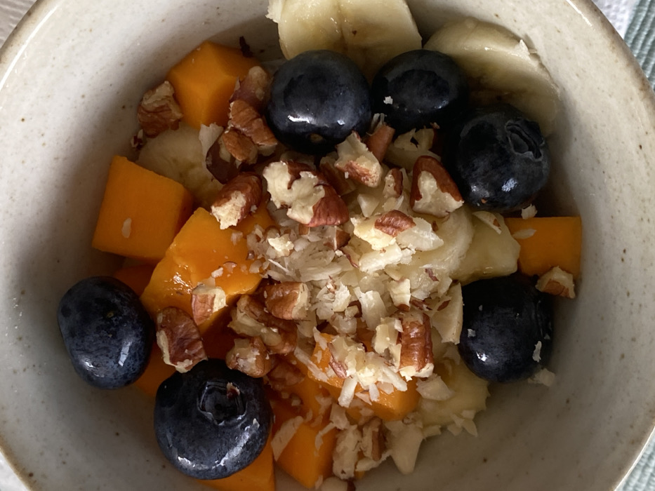 A top-down, close-up image displays a light-colored, speckled ceramic bowl filled with a fruit and nut mixture. The bowl's contents consist of dark blue blueberries, diced orange-yellow mango pieces, light yellow banana slices, roughly chopped brown pecan fragments, and white shredded coconut, with the coconut and pecans predominantly distributed over the other ingredients. The rim of the bowl, exhibiting minor surface imperfections, is visible. The bowl rests on an unidentifiable light-colored surface, with a faint light green striped pattern discernible at the bottom left edge of the frame. Illumination is bright and even. The location of the scene is Raanana, Israel.