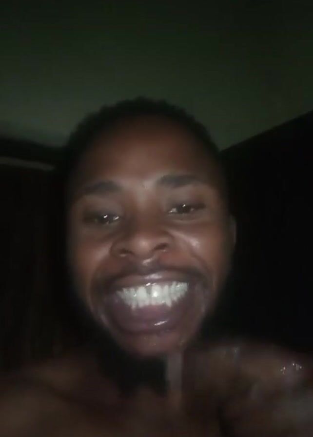A shirtless Black man with a beard and dreadlocks is visible from the chest up. The background is dark, and there appears to be a wall. The man is smiling widely, then covers his face with his hand and wipes it. He then sticks out his tongue and looks surprised. It appears the man may have had water splashed on his face.