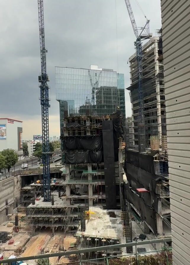construction site with multiple high-rise buildings in various stages of development. Two tall blue cranes dominate the skyline against a cloudy sky. Workers are seen on the upper levels of one of the buildings, some wearing hard hats and safety vests. They are working on scaffolding and what appears to be structural framework. Black tarps hang from the building, possibly for safety or containment purposes. The foreground of the site shows exposed foundation work and construction materials. A smaller building with a billboard is visible in the distance.