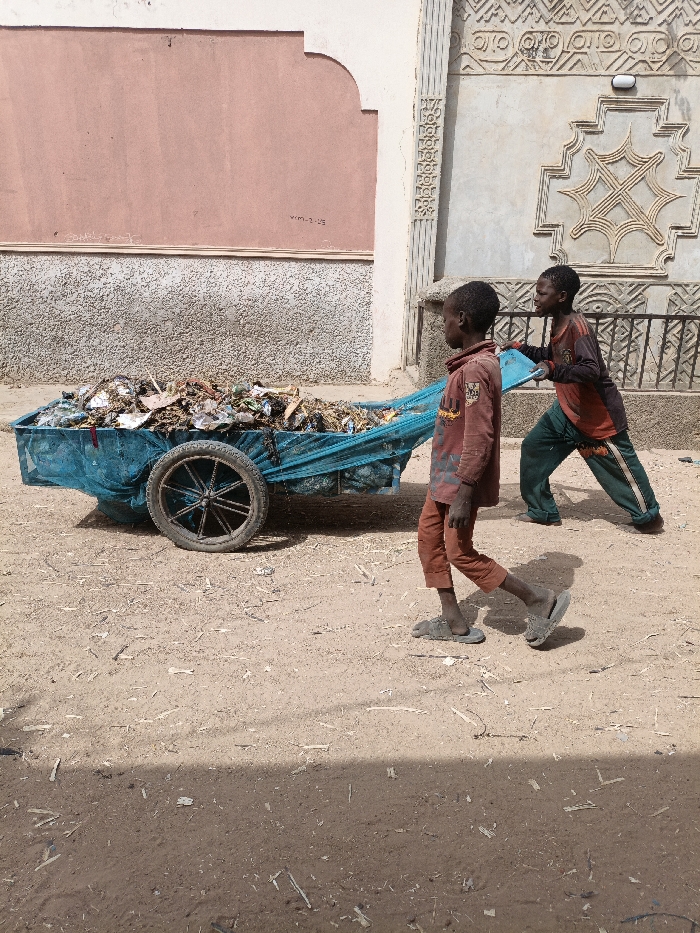 - "In Zango, Nigeria, two young males are transporting a refuse-filled, two-wheeled blue cart along a dusty dirt path under direct sunlight" by FM-Bh3W72, licensed under CC BY 4.0