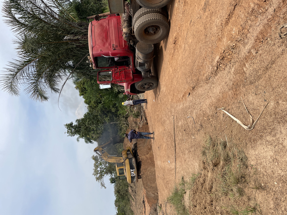 A red semi-truck parked on a dirt road with an excavator digging below. Two men stand near the truck, one wearing a yellow hard hat. Another man stands closer to the excavator, pointing or gesturing towards it. Green foliage and a tall palm tree surround the vehicles. A section of dug-out hillside can be seen in the lower right.