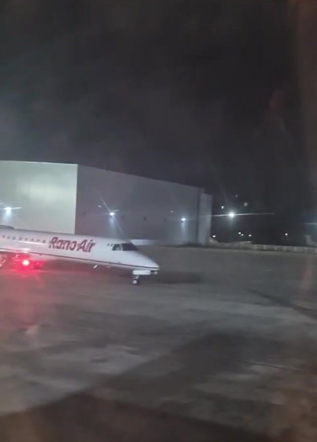 n aircraft of Rano Air parked outside a terminal at night. The plane is white with red accents, and the Rano Air logo is visible on the side. The environment is dark, with a large, flat building and some lights in the background. The video appears to be taken from inside another airplane looking out the window. The speaker in the background informs passengers that power banks are not permitted on board.