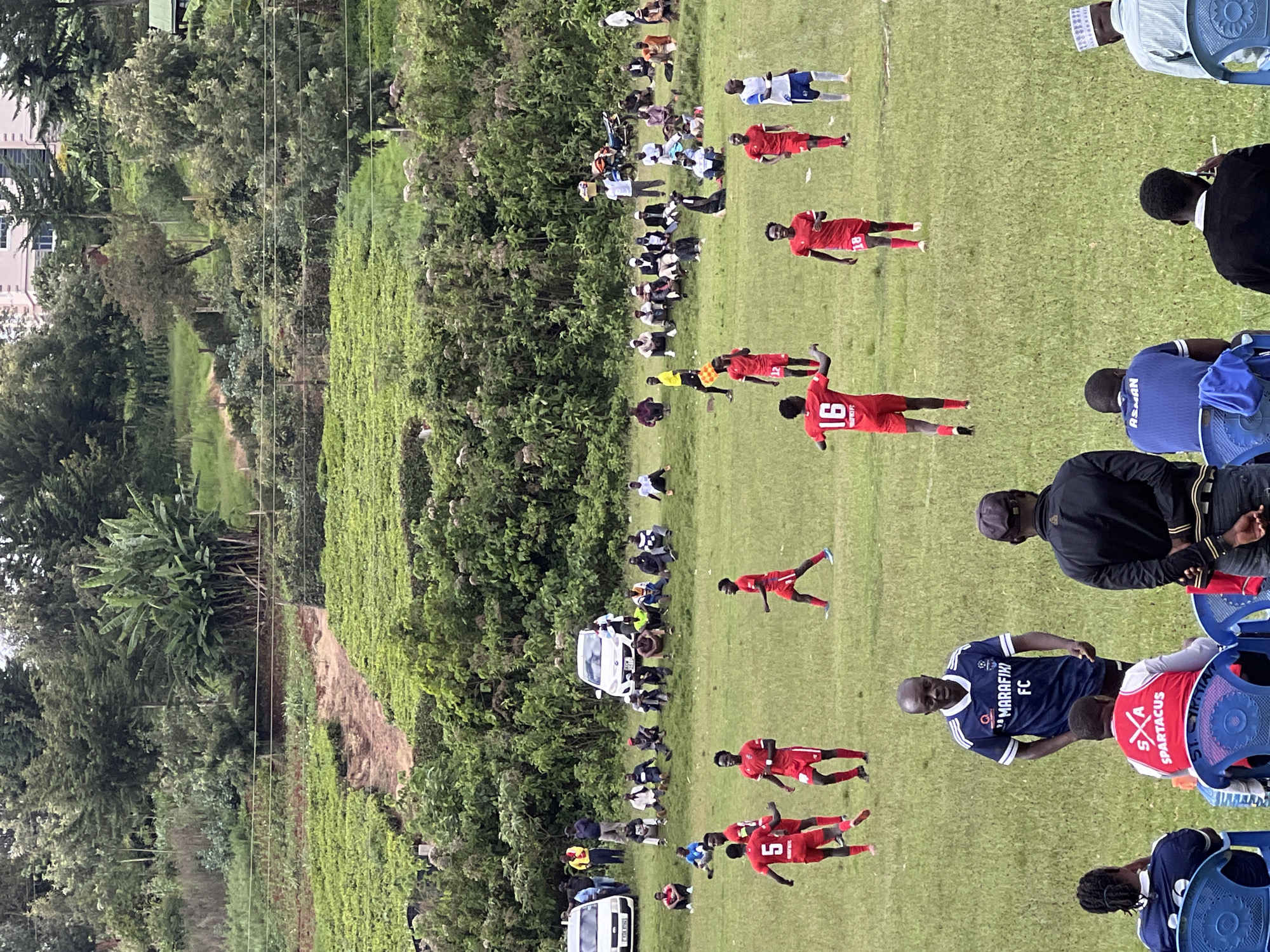 The image depicts a soccer game in progress in Nyeri, Kenya. Several players wearing red uniforms with white numbers are visible on the green field. Spectators line the edge of the field, many sitting on the ground or standing. A white van is parked near the sideline among the spectators. A referee in a yellow shirt and black shorts is also on the field. Some individuals are seated in blue plastic chairs. A lush green hillside with trees borders the soccer field. The location appears to be an open area with a soccer field amidst a hilly landscape near Nyeri, Kenya.