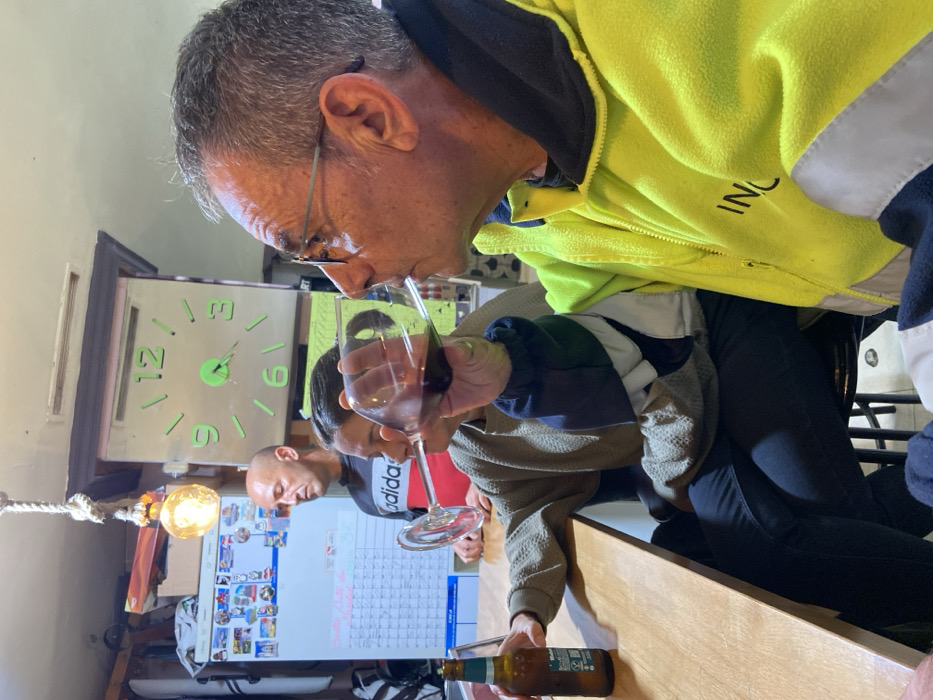 This image captures an indoor scene in Alicante, Spain, featuring three individuals gathered around a wooden counter. In the immediate foreground, a middle-aged male with grey hair and glasses, wearing a neon yellow fleece jacket with navy blue accents and "INC" lettering, is actively drinking red wine from a large, clear stemmed glass, held in his right hand. He is viewed in profile, looking left. To his left, a female individual with dark hair pulled back, wearing a textured light brown long-sleeved top and dark trousers, is seated at the counter. Her right hand rests near a green glass bottle, identified as Heineken, on the counter. In the background, a bald male wearing a black Adidas t-shirt stands behind the seated female, appearing to look downwards. The environment includes a white refrigerator adorned with various magnets and a large white wall calendar containing Spanish text. Above, a prominent square wall clock with green numerals (12, 3, 6, 9 visible) and green hands indicates a time near 1:55. An exposed filament lightbulb hangs from a knotted rope from the ceiling, illuminating the scene. The setting appears to be a casual, possibly utilitarian space such as a home bar or a relaxed communal area.