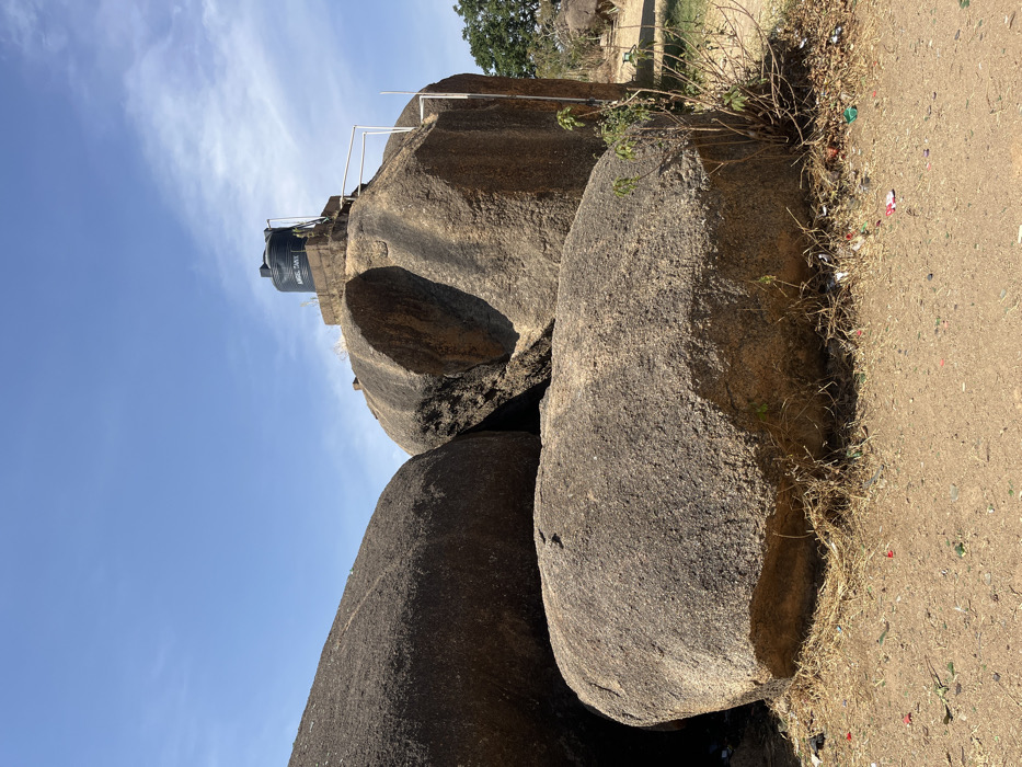 This image depicts a dry, outdoor scene in the city of Wang, Nigeria, under a clear blue sky with minimal cloud cover. The foreground and midground are dominated by several large, rounded, weathered dark grey-brown boulders of varying sizes. A prominent black plastic water tank, labeled "AMEL TANK," is situated on a rectangular concrete platform atop the largest boulder, positioned towards the upper-right quadrant of the image. A white metal pipe structure, resembling a rudimentary railing or support system, is visible on the right side of this boulder, extending from near the tank downwards. The ground is composed of dry, reddish-brown earth, uneven in texture. Sparse, dry grass and small, desiccated shrubs grow around the bases of the boulders. Scattered litter, including various plastic wrappers and small colored debris, is visible on the ground, particularly near the base of the foreground boulder. No individuals or animals are present. The scene is illuminated by bright sunlight, casting subtle shadows.