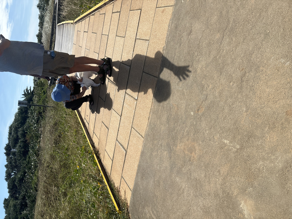 The image depicts an outdoor scene in Hengchun, Taiwan, featuring two individuals and a white dog on a paved path under clear skies. On the left, one person is crouched down, wearing a blue bucket hat, a patterned short-sleeve shirt, dark pants, and dark sandals. This individual is attending to a small, white, short-haired dog, holding its leash. Standing to the right of the dog is a second person, wearing a light gray t-shirt, khaki cargo shorts with a clear water bottle in the right pocket, and dark open-toed sandals. Both individuals cast prominent, dark shadows onto the ground, indicating strong sunlight from a high angle. The shadow of the standing person extends into the immediate foreground, showing the head and one hand. The path consists of two sections: a darker concrete foreground transitioning to a lighter, rectangular-tiled section. A yellow curb or border delineates the left edge of the tiled path. To the left of the path is a grassy embankment with tall green grass, some yellow wildflowers, and dense shrubs and trees further in the background. A wooden boardwalk structure is visible in the mid-ground, suggesting a continuation of the trail system. The sky is bright blue and clear.