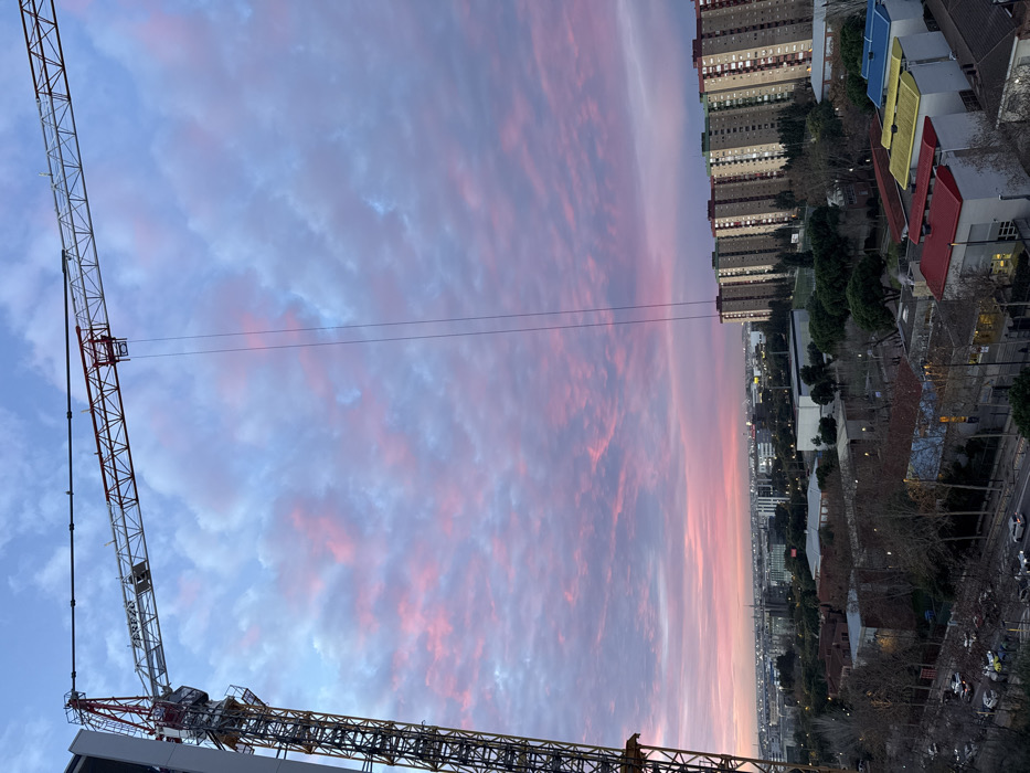 A cityscape is partially visible on the right, featuring buildings, trees, and a street lined with cars. The sky above is a blend of blue and pink hues, scattered with clouds. A construction crane occupies the left side of the frame, its metal structure stark against the colorful sky. The image is oriented vertically, with the sky and crane dominating the composition.