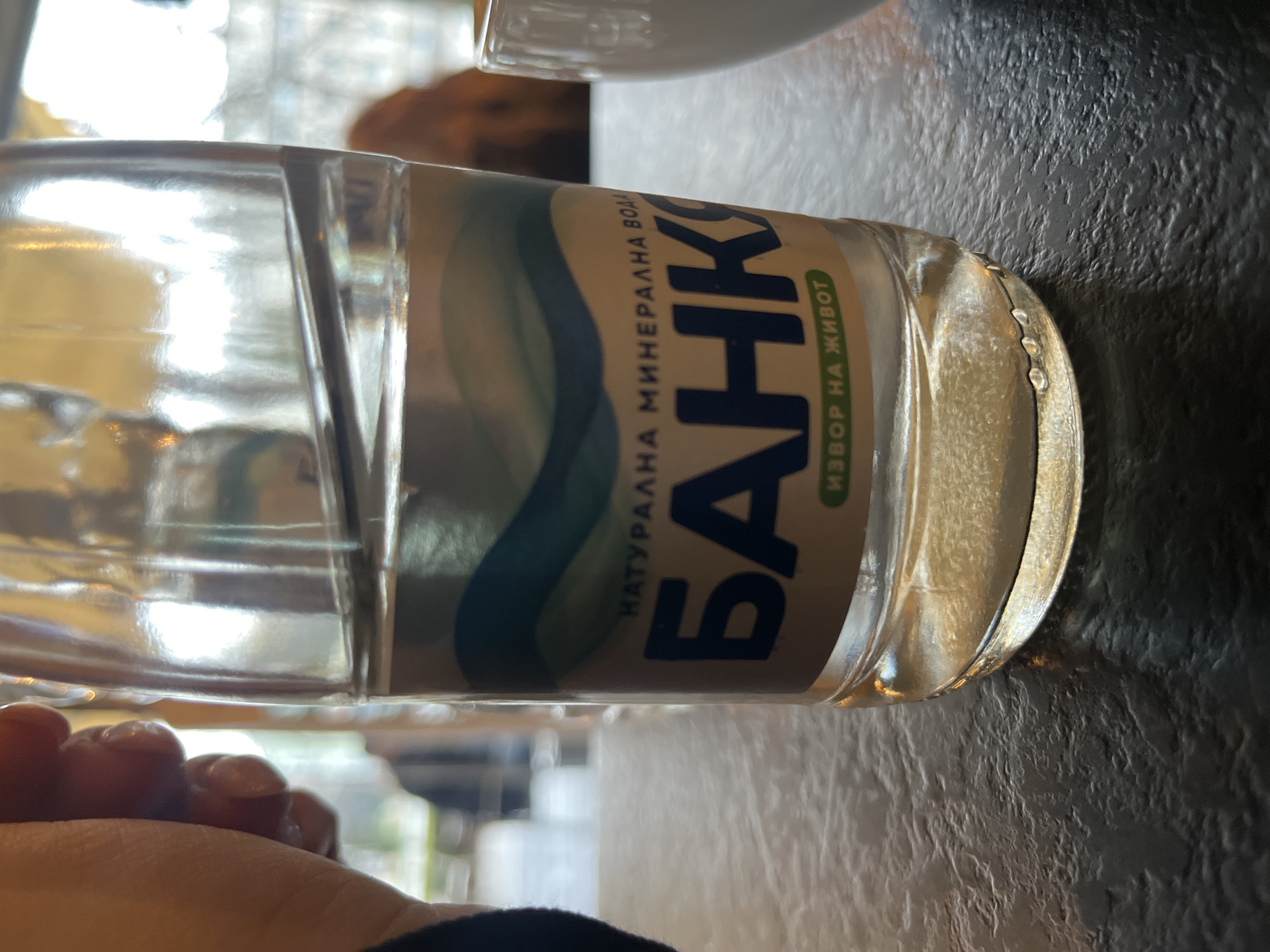 A clear glass bottle of "Bankya" natural mineral water, approximately two-thirds full, rests on a dark, textured surface. The bottle's label features a beige background with a blue wavy design, blue text reading "НАТУРАЛНА МИНЕРАЛНА ВОДА" (Natural Mineral Water), large blue text "БАНКЯ" (Bankya), and smaller green text "ИЗВОР НА ЖИВОТ" (Source of Life). Multiple small air bubbles are visible along the interior base of the bottle. A human hand, with light-toned skin, is partially visible on the left side of the frame, positioned near the bottle. To the right, a portion of a white ceramic cup or mug is visible, out of focus. The background is heavily blurred, suggesting an indoor environment, possibly a cafe or restaurant, with indistinct shapes and light reflections. The presence of Bankya mineral water confirms a Bulgarian context; however, specific visual cues within the image to definitively identify the city as Targovishte, Bulgaria, are absent.