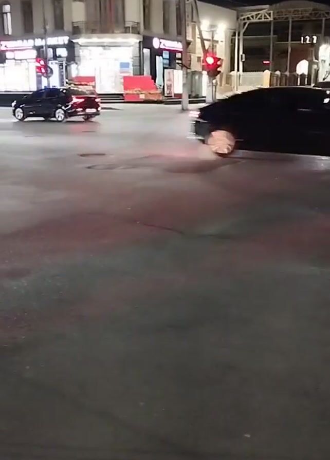 At night, several cars are driving on a wet asphalt road. The traffic light is red. Buildings with lighted windows and signs are visible on the side of the road. The cars include a black sedan, a white sedan, a silver sedan, and a white SUV.