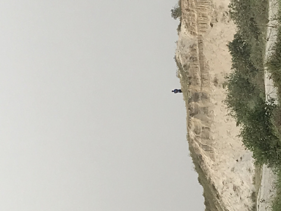 A person stands at the edge of a tall cliff. The cliff face is light in color, with visible layers and textures. Vegetation grows along the top and down the side of the cliff. The sky is overcast and white. The person is wearing dark clothing. A paved road appears at the lower right corner of the frame.