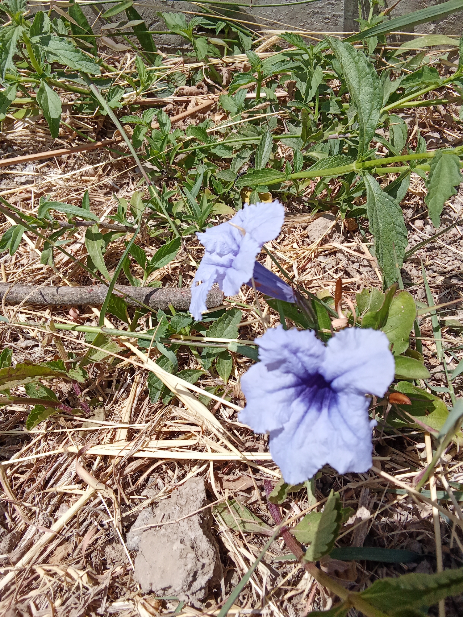 A close-up, ground-level photograph depicts an outdoor scene in the city of Guacamaya, Venezuela, under bright natural light. The ground is composed of dry, light brown grasses and straw, intermingled with green foliage from various weeds and small plants. Patches of exposed reddish-brown soil and small, light-colored stones are visible. Two light purple, trumpet-shaped flowers are prominent; one is centered in the lower frame, and the other is positioned above and to its left. A smaller, darker purple flower or bud is situated between the two main blossoms. A thin, brown, weathered stick lies horizontally across the mid-left section of the image. A slender, green, stick-like insect is camouflaged among the green plant stems in the upper-left quadrant. A light-colored concrete or stone surface is partially visible in the upper-right background. No human subjects, animals (other than the insect), or overt actions are depicted.
