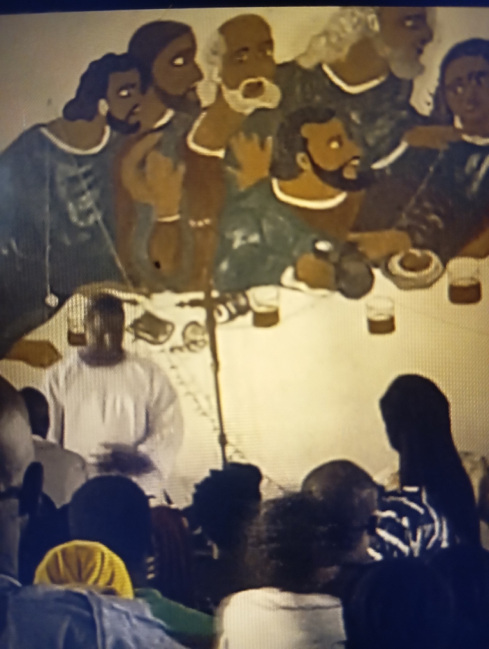 A gathering of people sits below a mural depicting a stylized version of the Last Supper. The mural features figures around a table with plates and cups. Below, a person in white stands facing the seated audience. Individuals in the crowd have their backs to the camera, with various hairstyles and clothing visible. The overall image captures a scene of a presentation or sermon taking place in front of religious artwork.