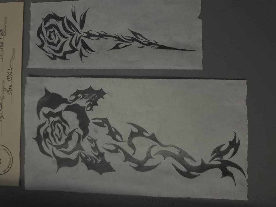 A static indoor scene in the city of Unknown, United States, displays two tribal-style rose drawings affixed to a dark gray wall