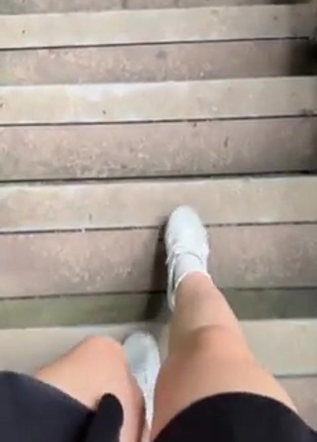 A person wearing white tennis shoes and a short black skirt is walking down a set of wooden stairs. The camera is positioned above the person's legs, providing a first-person view of their descent. The stairs appear to be outdoors, with some signs of wear and weathering on the wood. The light seems to be natural.