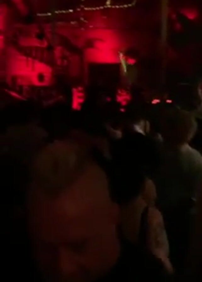 crowd of people at a dance party in a large, dark space illuminated by red lighting. The camera pans upward to reveal a high ceiling with exposed beams, decorations, and string lights. The crowd is dense, with people standing and moving. Some figures have their backs to the camera, while others are partially obscured. The overall atmosphere is dark and energetic, with the red lighting adding to the intensity of the scene.