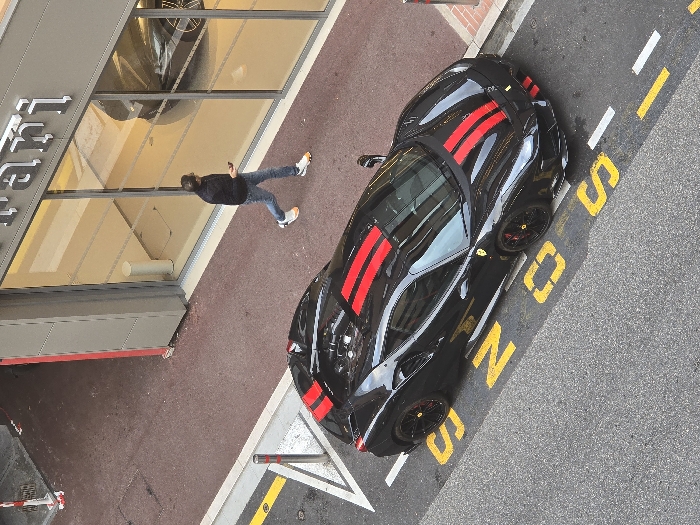 The image displays an urban street scene in Monaco, Monaco, positioned in front of the Ferrari dealership at 18/20 Boulevard Charles III