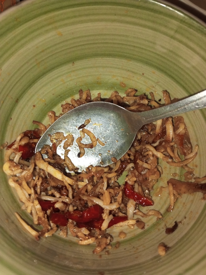 The image displays a close-up, overhead view of a light green ceramic bowl, featuring concentric darker green swirling lines. Within the bowl is a quantity of cooked food, primarily composed of numerous small, elongated, light brown to reddish-brown ingredients, intermixed with a darker, oily sauce or seasoning. Several distinct, whole red chili peppers are visible throughout the dish. A silver-colored metal spoon rests within the food, partially submerged, with some of the ingredients adhering to its surface. No individuals are present in the scene. The specific environment within the city of Melakudikadu, India, beyond the contents of the bowl, is not discernible.