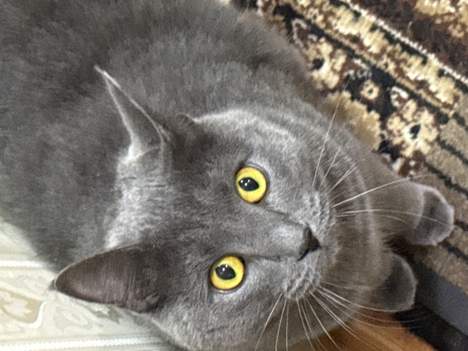 - "An overhead view captures a solid gray domestic cat with short fur in an indoor setting in Прикамский, Russia" by FM-oYDji2, licensed under CC BY 4.0