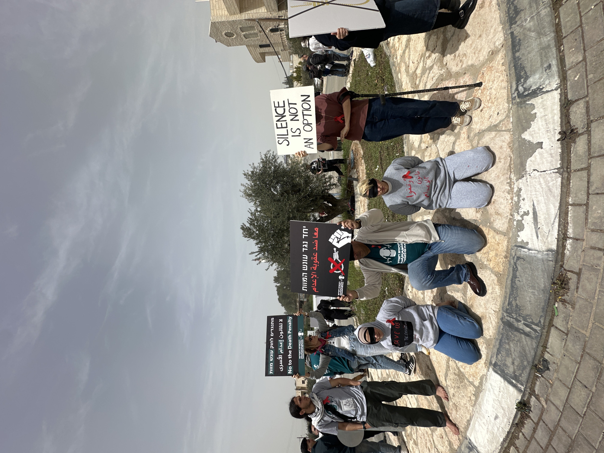A daytime outdoor scene in a-Doha, Palestinian Territory, shows a group of people protesting. The protesters are kneeling or sitting on the ground and holding signs written in both Hebrew and Arabic. One sign reads "SILENCE IS NOT AN OPTION." Another sign conveys opposition to the death penalty in Hebrew and Arabic. Some protesters wear head coverings. The sky is overcast. A building with distinct architectural features is visible in the background, likely a landmark. The ground appears to be a paved area with some patches of grass.