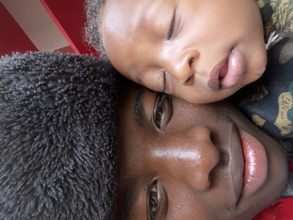 A close-up, vertically oriented portrait captures two individuals of African descent. The primary subject, an adult or young adult, occupies the lower and left portions of the frame. This individual has dark brown skin, open brown eyes directly facing the viewer, a visible nose, and lips curved into a slight smile. A dark, textured, charcoal-grey fuzzy head covering is worn, obscuring the forehead and hair. A red garment is visible on the lower left. Pressed against the first subject's right side, in the upper and right portions of the frame, is an infant. This infant exhibits lighter brown skin, closed eyes suggesting sleep or rest, a small nose, and partially open lips with visible moisture around the lower lip. Short, dark, curly hair is visible on the infant's scalp. A dark fabric with a subtle light-colored pattern is draped over the infant's shoulder. The background is out of focus, featuring a distinct red surface with a diagonal white stripe in the upper right quadrant, contrasting with a solid red surface visible in the upper and lower left. The scene is located in the city of Jos, Nigeria.