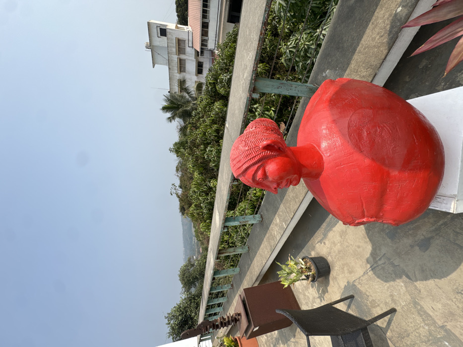 The image displays an outdoor terrace or rooftop located in Marra, India, under a clear, bright blue sky. In the immediate foreground, a prominent red sculpture of a female bust and torso is positioned, featuring a head with textured hair pulled back and a rounded, simplified body, resting on a white rectangular plinth. To the left, a partial view of a black woven outdoor chair, a small potted plant with green and yellow variegated leaves, and a dark brown abstract sculpture composed of stacked, irregular forms on a rectangular pedestal are visible. A concrete railing, exhibiting weathered blue-green vertical metal supports, extends horizontally across the midground. Beyond this railing, a dense canopy of green trees and foliage spans the landscape. A multi-story white building with a distinctive angular roof and multiple windows is situated among the trees on the right side of the background. Distant landforms or urban elements are faintly discernable beneath the horizon.
