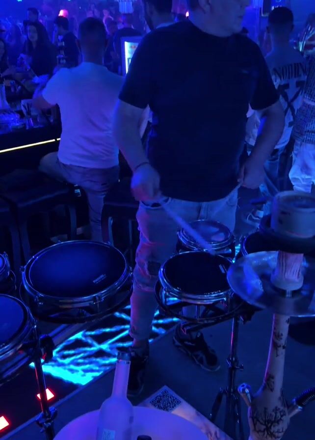 person playing drums in a nightclub setting. The individual is standing behind a compact drum kit, rhythmically striking the drums with drumsticks. The club is dimly lit, with blue lighting effects illuminating the scene and creating a vibrant atmosphere. Numerous people are visible in the background, some standing at the bar, indicating a busy and lively environment. A table in the foreground holds a bottle of liquor, some mixers, and a hookah, suggesting a relaxed and social atmosphere.