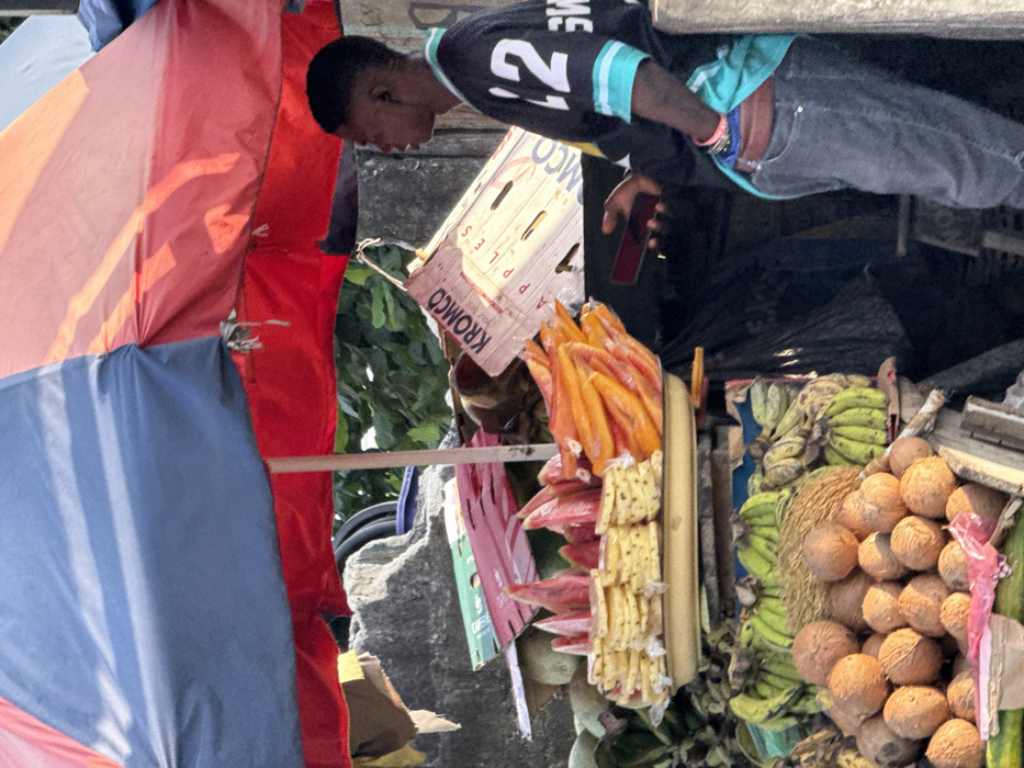 A man with a dark jersey featuring the number 21 looks down at a mobile phone. He stands near a fruit stand, displaying coconuts, bananas, mangoes, and pineapples. Cardboard boxes with "KROMCO APPLES" printed on them are visible. Red and blue tarps are nearby, possibly forming part of the stand's structure. A stone structure or wall is behind the fruit stand.