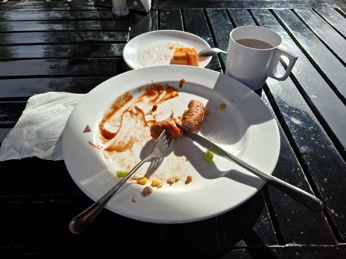 - "The scene is a table in a restaurant, likely outdoors, as evidenced by the black, slatted surface, likely wooden, and the sunlight reflecting on the table" by FM-5NbSf1, licensed under CC BY 4.0
