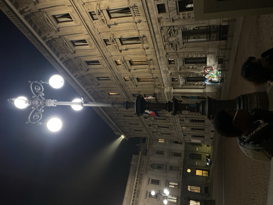 This nighttime image captures a scene in Piazza della Scala, Milan, Italy, specifically focusing on Palazzo Marino, the city's municipal building. The foreground is dominated by a dark, ornate, cast-iron lamppost with four brightly glowing spherical lamps. Attached to the lamppost are two Italian flags (green, white, red) and two French flags (blue, white, red), alternating. To the right, the multi-story Palazzo Marino stands prominently, constructed of light-colored stone with numerous rectangular windows, many displaying illuminated interiors. The building features classical architectural elements including cornices, decorative pilasters, and intricate window surrounds. Near the ground level, below a series of arched windows, a large, illuminated display of the five Olympic rings (blue, yellow, black, green, red) is visible, positioned against the facade. Several indistinct figures are visible near this display. To the left, another classical multi-story building, lighter in tone, is partially visible. From its upper portion, a narrow beam of white light projects diagonally upwards into the dark night sky. Another multi-globed lamppost stands in front of this building. The ground level of the square features patterned cobblestone paving. In the immediate foreground, partially obscured, are two individuals. One person, with dark skin and short dark hair, wearing a dark jacket and white-framed glasses, is seen in profile, looking towards the right side of the frame. Another person with dark hair is partially visible to the right and slightly below the first individual. In the far distance on the left, a vehicle with illuminated headlights is faintly visible moving across the square. The sky is dark and clear.