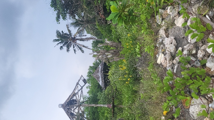 Lush vegetation surrounds a dilapidated wooden structure, possibly a building or tower, with only skeletal remains visible. Palm trees rise in the background under a cloudy sky. Rocks and more greenery frame the right side of the image. The scene evokes a sense of tropical decay and abandonment.