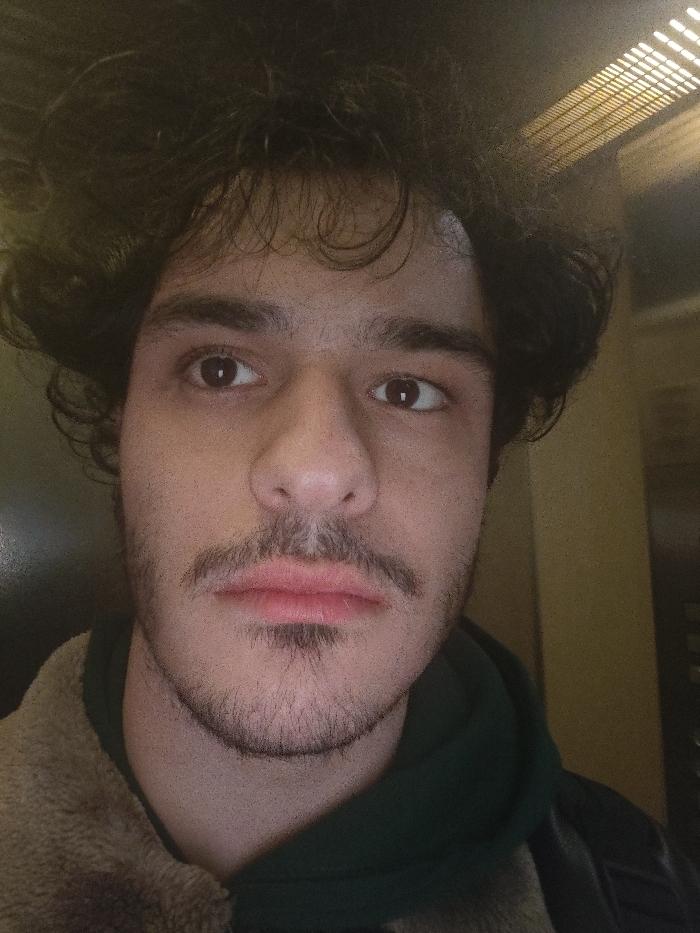 The image depicts a close-up, head-and-shoulders portrait of a male individual. He is a young adult with fair skin, dark, curly hair, and dark eyebrows. His brown eyes gaze slightly to the viewer's right. Facial hair includes a dark mustache and a sparse, patchy beard covering the chin and jawline. His lips are a natural pink tone, slightly parted. The subject is wearing a dark green hooded sweatshirt, visible beneath a light brown or tan jacket with a visible textured collar, possibly fleece or shearling. A dark garment, potentially leather, is visible on the subject's right shoulder. The background is out of focus, indicating an indoor setting with artificial lighting. A rectangular light fixture with horizontal slats, emitting a warm glow, is visible in the upper right quadrant of the background. The wall behind the subject appears light brown or tan. The specific location within Strasbourg, France, cannot be determined from the visual information provided.