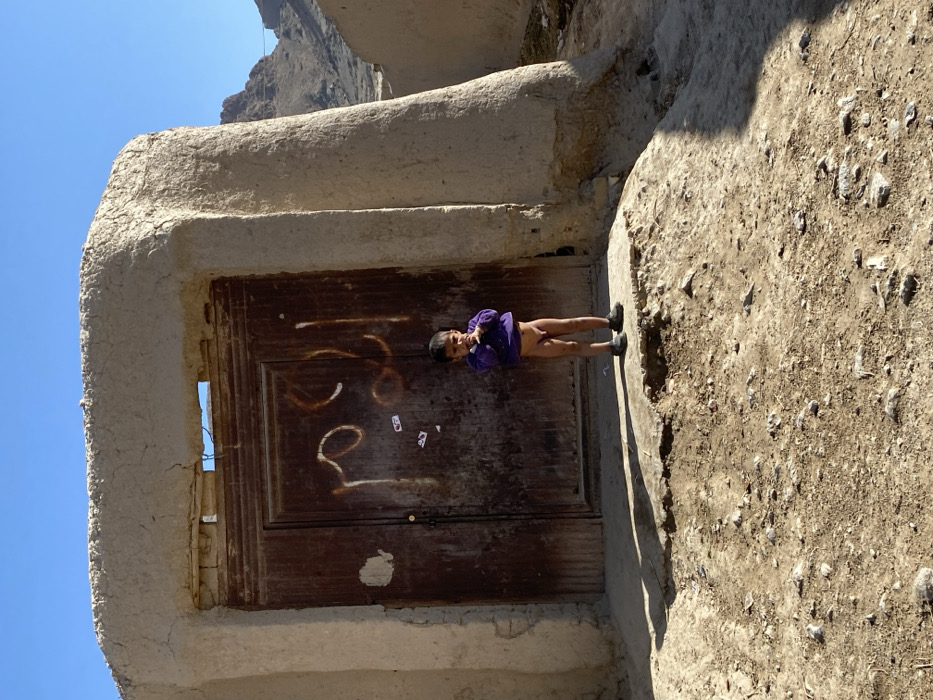 The image displays an outdoor scene under bright daylight in the city of Unknown, Unknown. A young child, appearing male and approximately 2-4 years old, stands centrally on an elevated, irregular concrete or packed dirt platform. The child wears a long-sleeved purple top and dark shoes, but no pants or undergarments, with the lower body exposed. The child's hands are clasped near the chest, and the gaze is directed forward. A distinct shadow extends from the child to the left, indicating the sun's position. Directly behind the child is a large, weathered, dark brown wooden double door featuring vertical panels. White or light-colored markings, resembling Arabic script and numerals (specifically '٢٥' and '٣'), are visible on the door. This door is recessed within a thick, light-brown mud or adobe archway. An opening or transom is present above the door, allowing a view of the sky beyond. To the right of the archway, another thick mud/adobe wall or structure is visible. The foreground consists of dry, uneven ground composed of loose earth, small stones, and debris. In the mid-ground, towards the right, a dirt path or road ascends past additional mud/adobe structures. The far background reveals barren, rocky mountains under a clear, light-blue sky.