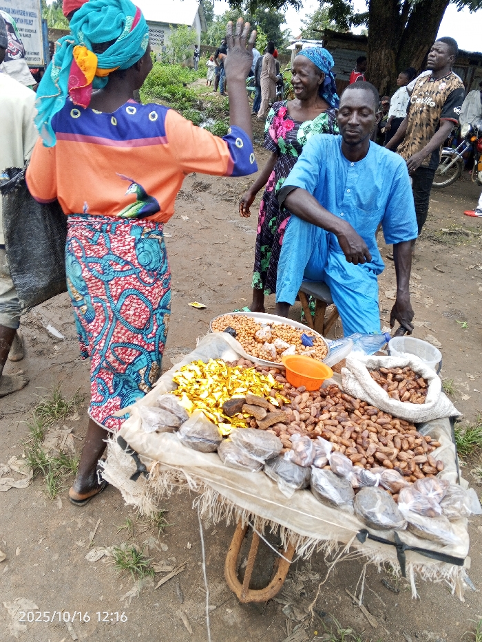 This image depicts an outdoor market scene in Unguwan Rimi, Nigeria, captured on 2025/10/16 at 12:16. In the foreground, a low vendor's table or cart, covered with a light, possibly burlap-like fabric, displays various food items. These include a central pile of numerous brown, elongated nuts or dried fruits (possibly dates), a white sack on the right also containing these items, and a silver platter on the left holding light-colored, roundish nuts (e.g., groundnuts/peanuts). Next to the nuts, a pile of bright yellow, possibly dried fruit slices or chips is visible. Several dark, irregularly shaped items, individually wrapped in clear plastic bags, are arranged along the bottom edge of the table. An empty orange plastic bowl and a blue plastic bottle are also present on the table. To the right of the table, a dark-skinned man wearing a light blue traditional tunic and trousers sits on a small, dark stool, looking forward with a neutral expression. His hands rest on his lap and near the table. Behind the vendor, a dark-skinned woman in a black dress with vibrant pink, purple, and green floral patterns and a light blue headwrap smiles while looking towards the left. In the left foreground, a dark-skinned woman stands with her back to the viewer. She wears an orange long-sleeved shirt with a blue upper section and a green bird motif on the back, a patterned red and blue skirt, and a light blue headwrap with colorful accents. Her right arm is raised and bent, with the palm facing away, appearing to make a gesture or wave. She holds a dark bag in her left hand. The ground is a reddish-brown dirt path with sparse patches of green grass. In the middle ground and background, several other individuals are visible, walking or standing, suggesting a populated public space. Green foliage from trees and bushes, along with glimpses of simple buildings and a partially visible motorcycle, define the outdoor environment under diffused daylight.