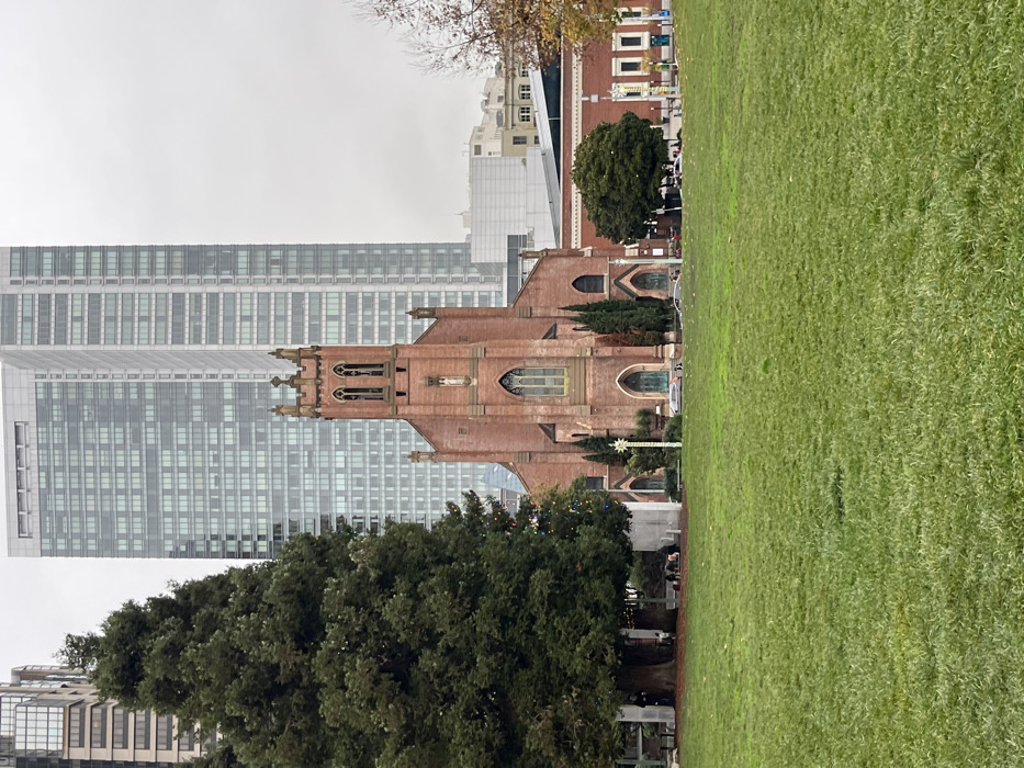 An image shows an upward view of a brick church with a tall steeple in front of a modern high-rise building. The church is surrounded by trees, some with holiday lights. To the right of the church is a grassy area. The sky is overcast, and the overall color palette is muted. Modern buildings and rooftops are visible in the background.