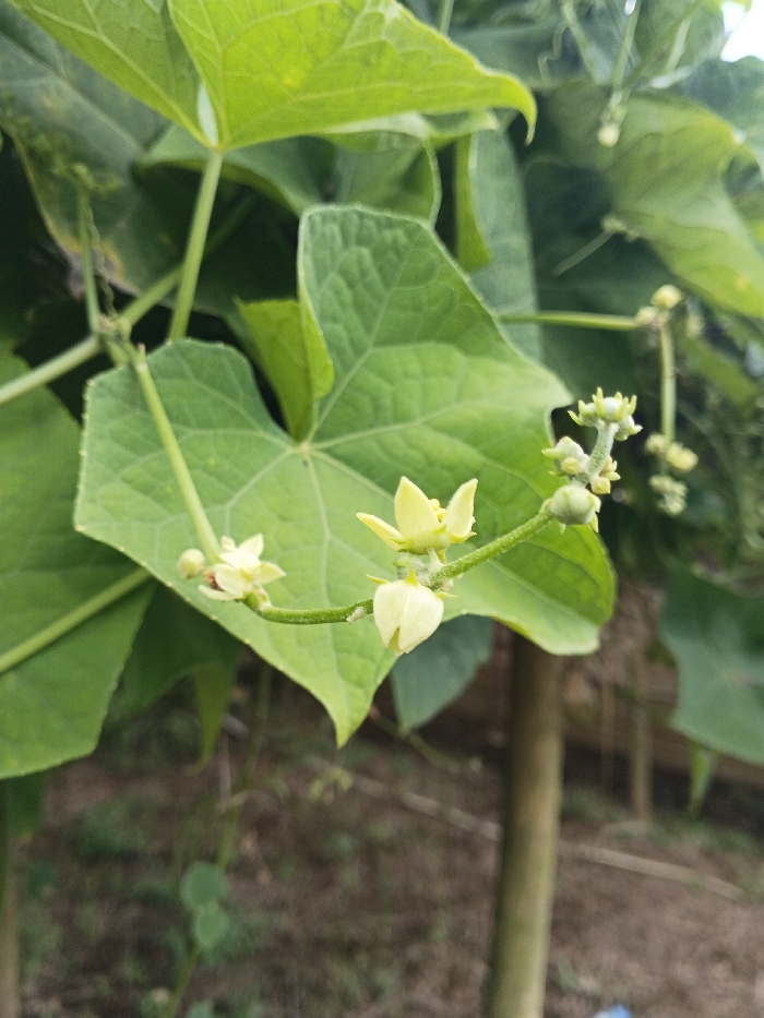 The image displays a close-up, natural light photograph of a plant in Maw Hit, Myanmar. The primary subjects are a cluster of small, pale yellow flowers and buds, along with numerous large, green, heart-shaped leaves, all in various stages of growth. In the foreground, a slender green stem extends diagonally from the lower-left to the upper-right, featuring several small inflorescences. On the left side of the stem, a small, partially opened flower with pale yellow petals is visible. To the right, another flower, appearing as a closed bud or bell-shaped structure, is centered. Directly above it, a fully open flower with five distinct, pale yellow petals is present. Further to the right along the stem, a cluster of smaller buds and developing flowers is visible. The petals of the open flowers exhibit a soft yellow hue. The background is dominated by large, vibrant green leaves with prominent venation, some appearing lobed or deeply indented, others more broadly ovate. These leaves vary slightly in shade, with some areas appearing lighter due to illumination. A blurry, dark brown and green expanse in the lower-right background suggests ground level or a denser foliage area. A vertical, dark brown, out-of-focus element, possibly a tree trunk or wooden support, is visible along the right edge of the frame. The overall scene suggests an outdoor, natural environment. No human subjects, animals, or specific actions are depicted.
